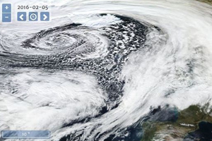 eoNetTambora sammelt aktuelle Daten der NASA – hier eine Satellitenaufnahme des Sturms „Imogen“ über Irland vom Februar 2016 – und historische Klimaaufzeichnungen. Quelle: NASA/GSFC/Earth Science Data and Information System